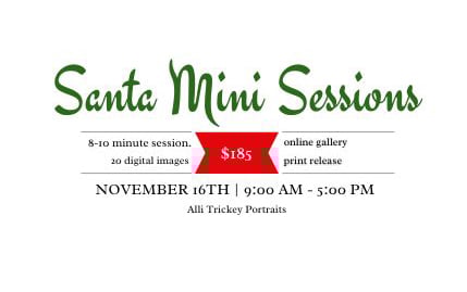 *One mini session is needed for EACH family nuclear unit (this means if you wish to include cousins, friends, etc. in for a group photos, they also must also purchase their own mini session spot. If they do not, they will not be photographed or allowed in Santa's area.)